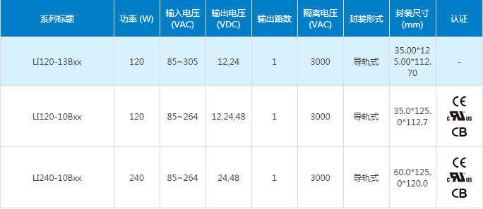 LI系列是导轨式AC/DC模块电源,功率段为120W、240W,该系列产品拥有体积小、重量轻、节能环保的特点。