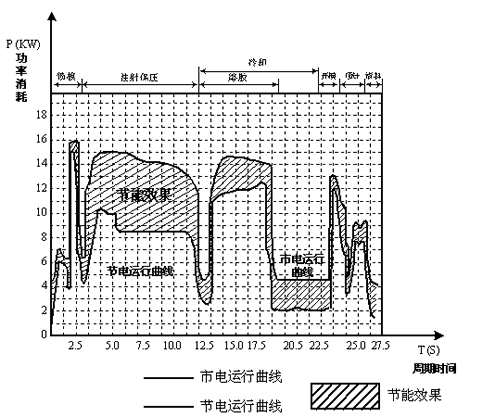 例如一台CLF-600型注塑机在生产某种塑料工件时,整个工艺周期约为52秒,经现场测得其各工艺阶段,所需时间和 油泵电机负载电流如下: 锁模/射台前进: 4.0秒 76A 射胶: 5.5秒 54A 保压: 9.0秒 52A 冷却: 29秒 53A(前9.3秒) 开模/射台后退: 3.7秒 76A 由此可见该系统各工序油泵实际所需功率变化很大,特别是射胶、保压和冷却阶段,设备所用的55KW油泵的电机利用率很低、 电机空转,其中有相当部分的电能浪费了。 根据注塑机这一工艺特性,我公司开发、研制出注塑机专用型变频器,将定量泵液压系统改变为变频控制系统。这种变频控制系统的运行将随工艺和工序要求,通过调节油泵电机转速,自动调节控制液压、油压的流量,从而达到节能30%~~60%的效果,并具有比原控制系统保护功能更强、更安全、更可靠的诸多特点。具体情况如下所示: