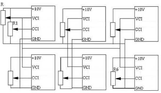 当一台整机要求在一个主令转速的设置下,各单元同步协调工作;可以配置同步控制器,该同步控制器可对各单元传动速度分别整定,以实现各单元以一定的比例速度同步工作。采用易能变频器可以不用同步控制器利用易能变频器两路模拟信号中的一路VCI模拟通道为主给定,负责同步控制,而另外一路CCI负责各部分的微调。