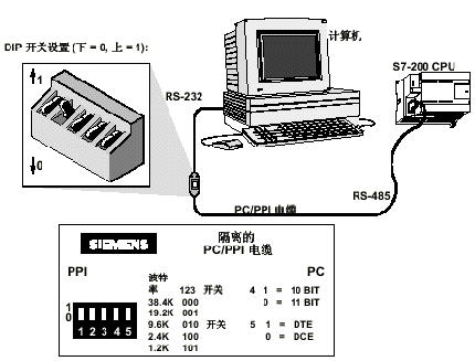 ------当数据从RS-232传送到RS-485口时,PC/PPI 电缆是发送模式。当数据从RS-485传送到RS-232口时,PC/PPI 电缆是接收模式。当检测到RS-232的发送线有字符时,电缆立即从接收模式转换到发送模式。当RS-232发送线处于闲置的时间超过电缆切换时间时,电缆又切换到接收模式。这个时间与电缆上的DIP开关设定的波特率选择有关。