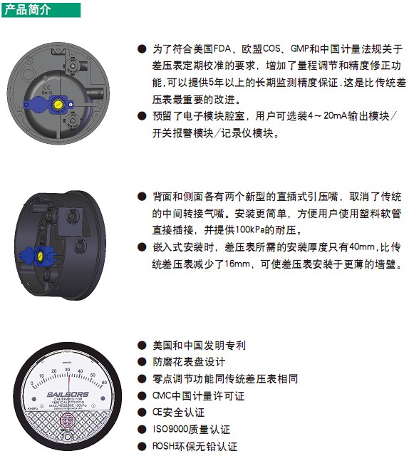 专利产品,符合美国FDA、欧盟COS、中国GMP等计量法规关于差压表定期校准的要求,增加了量程调节和精度修正功能,可以提供5年以上的长期监测精度保证. 是传统差压表的升级产品。在A2差压表上增加了满量程调节功能,用以满足差压表需定期校准的相关法规要求,同时采用的新式引压结构减少了安装时的工作量。 A2N系列差压表主要用于测量低压空气和非腐蚀性气体的正压、负压、差压,它广泛用于风扇和鼓风机的压力、风速、孔板差压等的测量,在制药、医疗设备制造、暖通空调、半导体等领域的应用前景广阔。