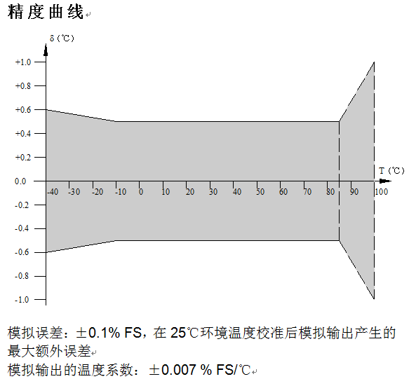 注1:任何选项下,都可以通过MMI设置量程在-10~85℃内,满足≤±0.5℃的精度。代码7可以扩展量程在-40~125℃内,满足≤±0.5℃的精度。