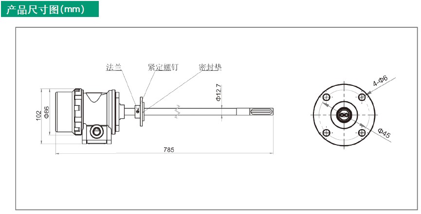 连接:带安装密封套的可管卸法兰。分体式安装时,变送器配有安装支架,探头与变送器之间带有赫斯曼接头,电缆由用户自备。